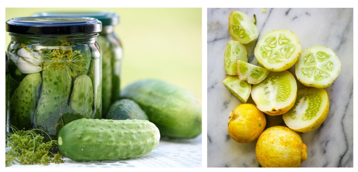 Apparently, there’s a ball-shaped cucumber that looks like a lemon and has bright citrusy quality called the cetriolo limone (lemon cucumber, or crystal cucumber.