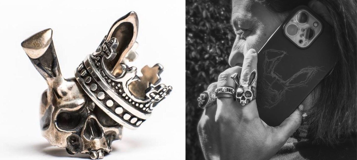 In the store, you’ll find chunky silver rings, intricately incised with larger-than-life stone settings, and some his signature shapes: a crocodile, a roaring tiger, a playfully creepy bunny skull, and a larger-than-life nodo fiorentino, a nod to the de’ Medici era symbol depicting two intersecting rings harmoniously formed from a single thread.