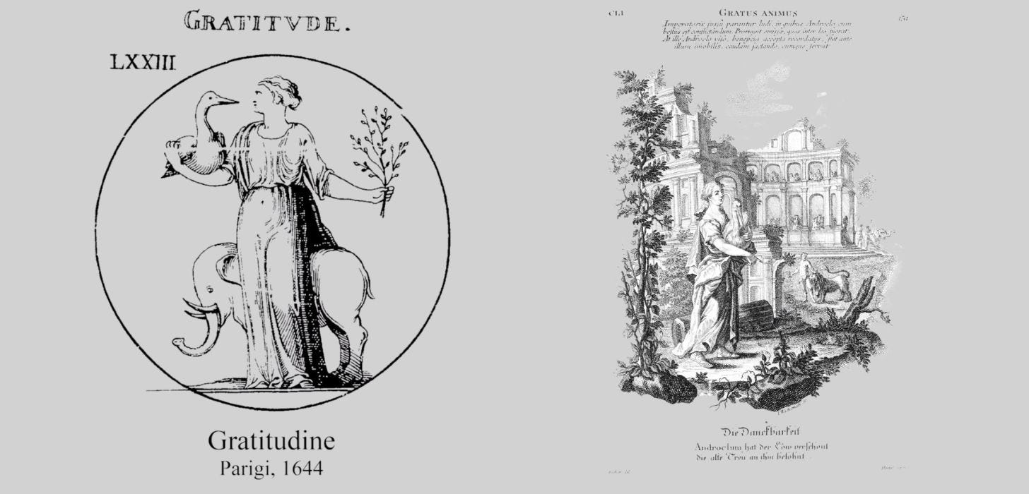 Renaissance imagery added an elephant to the figure of gratitude. The humanist symbol relayed loyalty, memory, and reciprocated kindness.