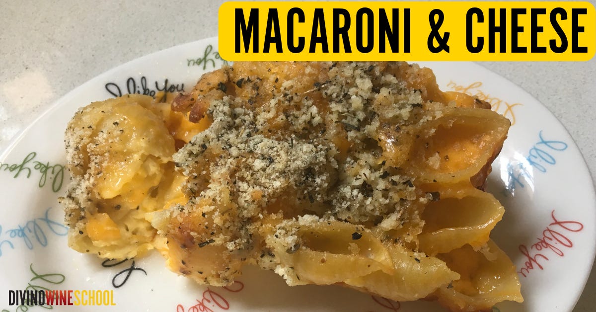 For example, Macaroni and Cheese as featured in our video on Champagne and food pairings, is a truly quintessential pairing with the right sparkling wine. It’s baked with sharp cheddar cheese, butter, and a little milk. It’s more solid and sliceable than creamy.